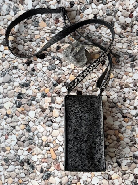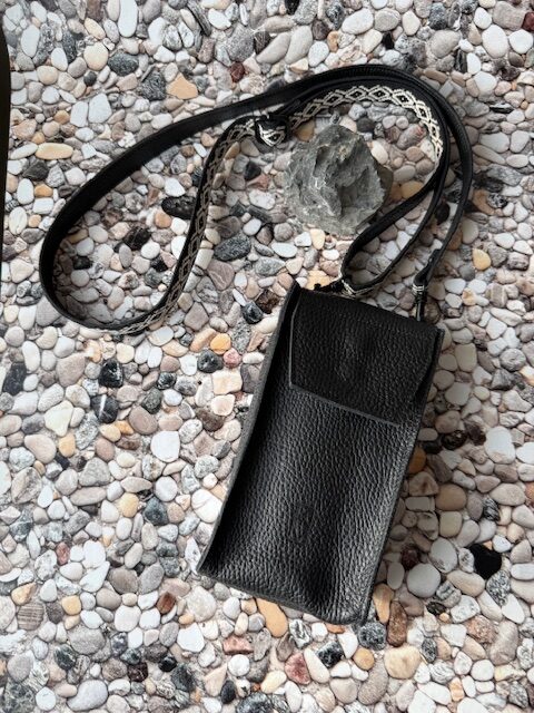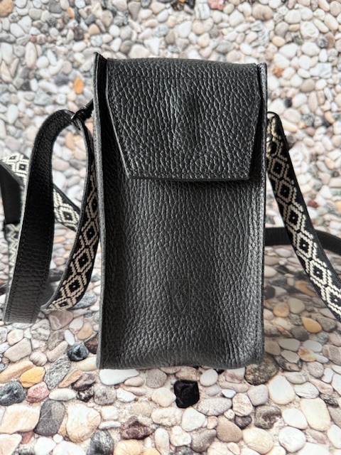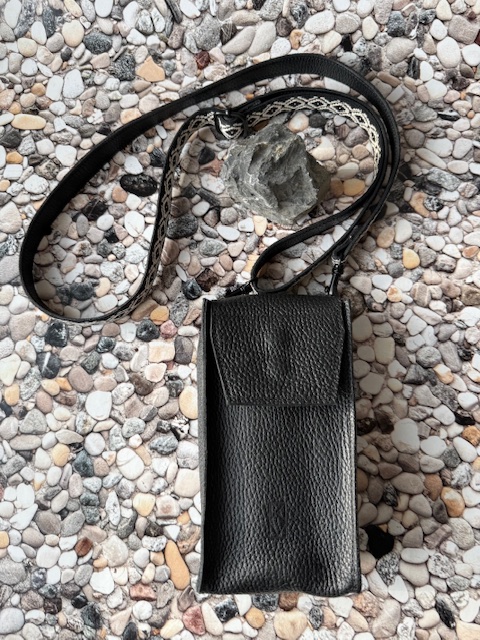 Kroomnahast mobiilikott mõõtudega 10x20x6cm, kahe trukiga kinnitus ning reguleeritav 2cm laiusest paelast õlapael, mis on mõlemast otsast kinntatud karabiinidega koti külge. Õlapaela pikkus 150cm. Kroomnaha päritolumaa: Itaalia; Materjali paksus: 1.2/1.4; Värv: must (#69); Tekstuur: reljeefne; Tehnikad: masinõmblused